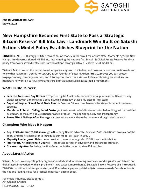 (데니스 포터 사토시액션펀드 CEO 엑스) 미국 뉴햄프셔주가 비트코인을 전략적 준비자산으로 편입할 수 있도록 하는 ‘HB 302’ 법안을 통과시키며, 디지털 자산을 공식 보유하는 첫 번째 주가 됐다.