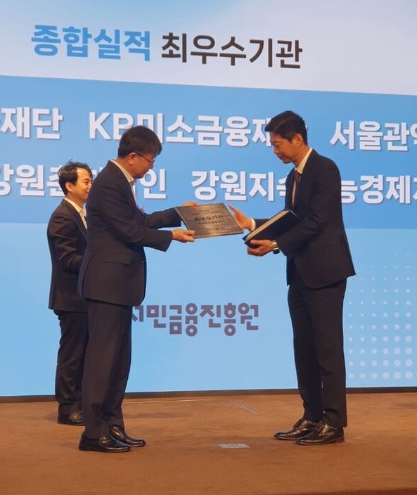 지난 9일 서울 로얄파크컨벤션에서 열린 서민금융진흥원 주관 '2025년 미소 플러스 워크숍' 시상식에서 박병권 KB미소금융재단 상임이사가 수상을 하고 있다. (사진=KB국민은행) KB국민은행의 KB미소금융재단이 서민금융진흥원 주관 '2024년 미소금융 사업운영 실적평가'에서 최우수 기관으로 선정됐다. 미소금융은 금융 소외계층을 지원하는 정책 금융상품으로, KB미소금융재단은 대출실적, 사후관리, 고객서비스, ESG평가 등에서 높은 평가를 받았다.