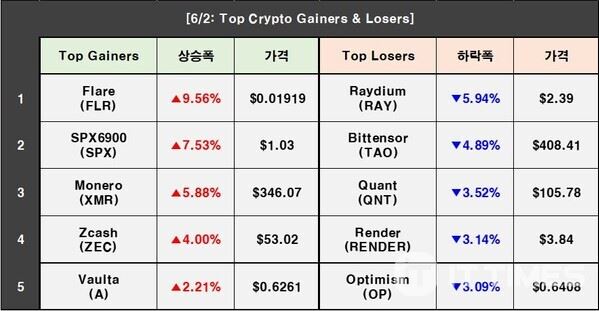 Read more: https://www.ittimes.com/news/articleView.html?idxno=76247Cryptocurrency Prices on June 2: BTC 0.92%↑, FLR 9.56%↑, RAY 5.94%↓ - IT타임스