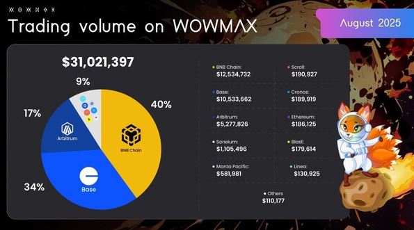 탈중앙화 거래소(DEX) 애그리게이터 플랫폼 와우맥스(WOWMAX)가 지난 8월 한 달간 체인별 거래량이 총 3,102만1,397달러로 전월 대비 11.39% 감소했다고 밝혔다. 체인별 순위에서는 BNB체인이 1,253만4,732달러로 1위를 기록했으며, 베이스(1,053만3,662달러), 아비트럼(527만7,826달러)이 뒤를 이었다.