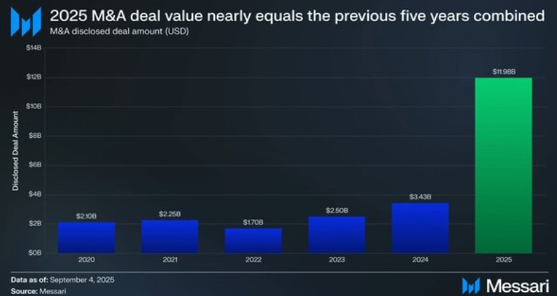 미국 가상자산 데이터 분석 기업 메사리(Messari)에 따르면, 암호화폐 업계의 인수·합병(M&A) 거래 규모가 지난 5년간 누적 총액과 맞먹을 것으로 전망된다.