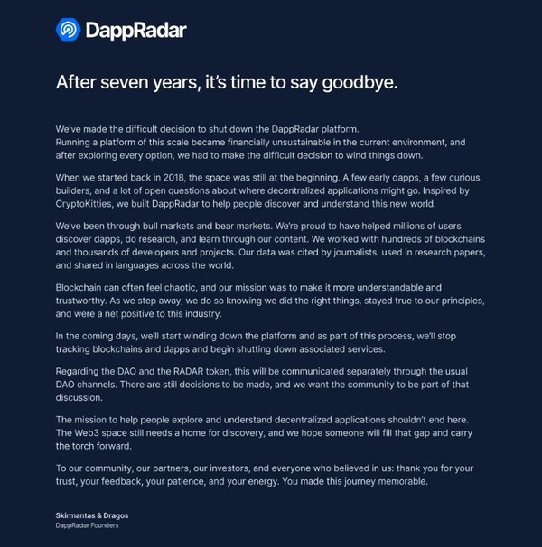 웹3 데이터 분석 플랫폼 댑레이더(DappRadar)가 서비스 운영 종료를 공식 선언했다. 네이티브 토큰 RADAR와 탈중앙화 자율조직(DAO)의 향후 운영 방안은 미정이다.