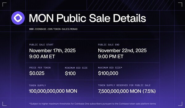 이더리움 가상머신(EVM) 호환 레이어1 블록체인 모나드(Monad)는 지난 17~22일(현지시간) 코인베이스에서 진행한 MON 토큰 세일을 성황리에 마무리했다고 23일 밝혔다.이번 토큰 세일에서는 전체 MON