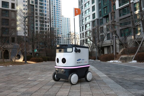 아파트 단지를 자율주행하는 음식배달로봇. (사진=삼성물산) 삼성물산이 배달플랫폼 '요기요'와 협력해 아파트 세대 현관까지 음식을 배달하는 자율주행 음식배달로봇 서비스를 확장 운영한다.