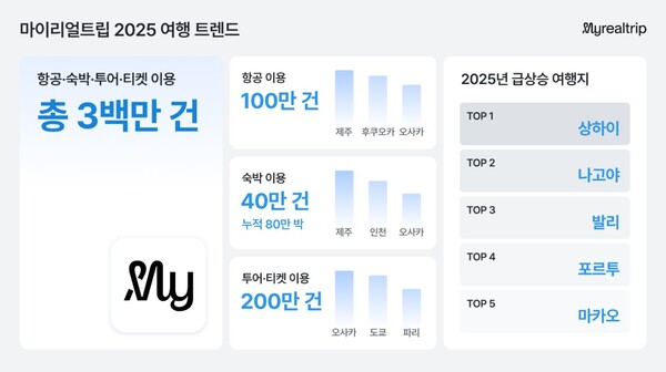 마이리얼트립이 2025년 한해 동안 자사 플랫폼에서 발생한 항공∙숙박∙투어∙티켓 이용 데이터를 분석한 '2025 여행 트렌드'를 공개했다.
