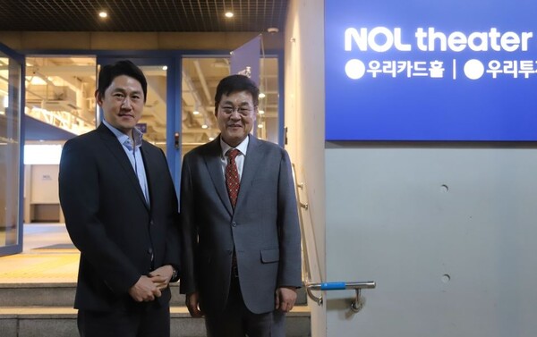 (왼쪽부터) 이철웅 놀유니버스 대표, 정문헌 종로구청장이 지난달 30일 NOL 씨어터 대학로에서 기념촬영을 하고 있다. (사진=놀유니버스) 놀유니버스가 대학로 일대 최대 규모 공연장인 'NOL 씨어터 대학로'를 지난달 30일 정식 개관했다.