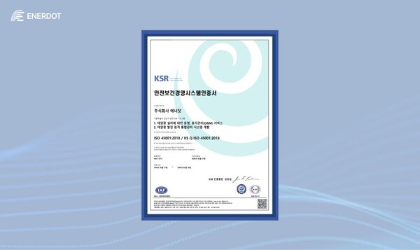 재생에너지 IT 솔루션 전문 기업 에너닷이 국제표준화기구(ISO)가 제정한 안전보건경영시스템 국제 표준 ‘ISO 45001’ 인증을 획득했다
