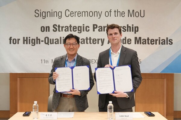포스코퓨처엠이 지난 11일 서울 코엑스에서 미국 몰튼(Molten)과 메탄가스를 활용한 천연흑연 음극재 원료 공동개발 양해각서를 체결했다.