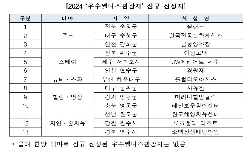 문화체육관광부(이하 문체부)와 한국관광공사(이하 관광공사)는 한국의 아름다운 풍경과 특별한 경험이 어우러진 곳, 우리의 몸과 마음이 치유되는 경험을 선사할 신규 우수 웰니스 관광지 13개소를 선정하여 25일 발표했다.