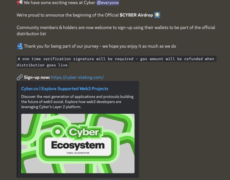 현재 사이버(Cyber) 공식 디스코드 채널의 공지사항에 피싱 링크가 게시되어 있다.