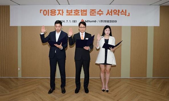 빗썸 임직원들은 '이용자 보호법' 준수 5대 행동지침으로, △이용자 자산 보호와 신뢰 우선 △업무 기밀 유지와 미공개 정보 이용 금지 △시세조종 등 불공정거래행위 방지 및 신고 △법률 및 규정의 적극 준수 △이용자 이익 우선 및 책임과 투명성을 지킬 것을 선언하고 서약서에 서명했다.