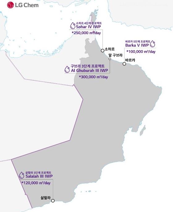 LG화학은 오만 구브라(Ghubrah) 3단계 담수화 프로젝트의 설계∙조달∙시공(EPC)사인 GS이니마에 역삼투막 2만3,000개를 공급한다.