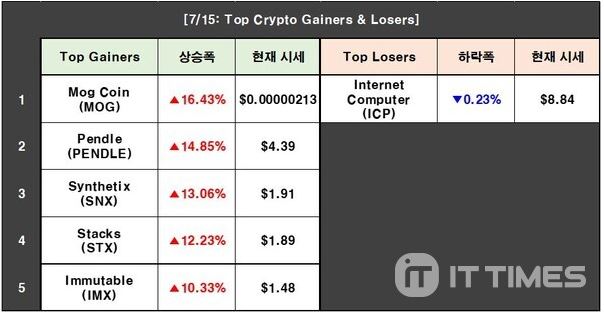 전일 대비 가장 많이 오른 코인은 16.43% 상승한 모그코인(MOG), 가장 큰 폭으로 떨어진 코인은 0.23% 하락한 인터넷컴퓨터(ICP)다.