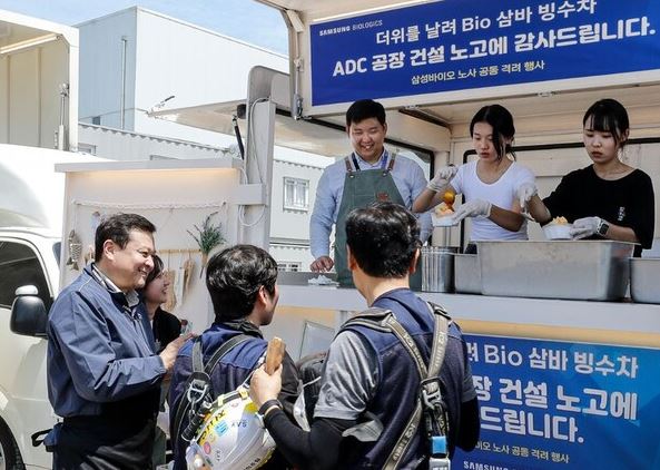 삼성바이오로직스가 지난 19일 인천 송도의 차세대 항암제 ADC(Antibody Drug Conjugate) 공장 건설 현장 협력사 기술인 900여명에게 시원한 빙수와 츄러스 세트를 제공하는 '삼바 빙수차' 행사를 진행했다.