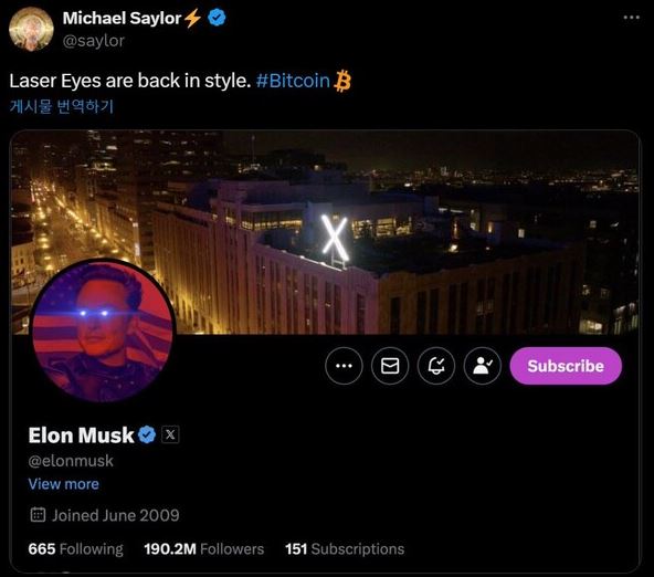 마이클 세일러(Michael Saylor) 마이크로스트레티지(MicroStrategy) 공동설립자가 일론 머스크 X(구 트위터) 프로필 사진에 등장한 '레이저 아이(laser eyes)'에 주목했다. 해당 밈은 2021년 비트코인 가격 급등 당시 비트코인 지지를 표현하기 위해 사용됐다.