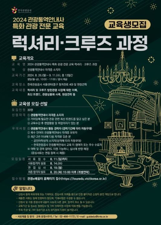 출처 IT타임스 : https://www.ittimes.com/news/articleView.html?idxno=41346관광공사, '럭셔리·크루즈 특화 관광 교육' 참여 관광통역안내사 모집 - IT타임스