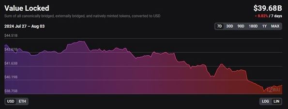 이더리움 레이어2 프로토콜의 TVL(총예치자산)이 지난 일주일 새 8.82% 감소한 396억8,000만달러(약 54조240억원)를 기록했다.