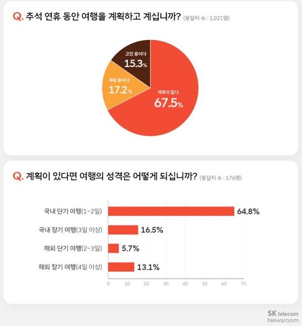 추석 연휴 계획을 물어본 SKT의 설문 결과, 응답자 10명 중 4명(42.7%)만 '고향 또는 가족, 친척 방문'을 계획하고 있다고 답했다.