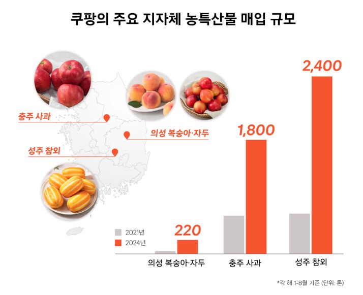 최근 3년간 쿠팡과 손을 잡은 충주 사과, 성주 참외 등 지역의 특산물 판로가 전국으로 확대됐다. 쿠팡이 이들 지역과 손을 잡고 지방 농가의 우수 과일 특산물 매입을 크게 늘려 전국 로켓프레