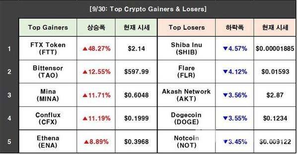 9월 30일 Top Crypto Gainers & Losers (데이터=CoinMarketCap)