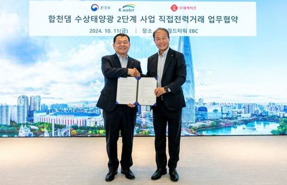 롯데케미칼은 지난 11일 서울 롯데월드타워 EBC에서 한국수자원공사(이하 한수원)와 '합천댐 수상태양광 2단계 사업 직접전력거래 업무협약'을 체결했다고 14일 밝혔다.합천댐 수상태양광 2단계