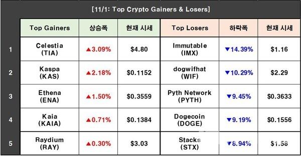 11월 1일 Top Crypto Gainers & Losers (데이터=CoinMarketCap)