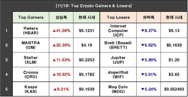 · 헤데라(HBAR) +41.08%로 가장 크게 상승