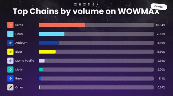와우맥스에 따르면, 10월 한달간 플랫폼에서 거래된 총 금액은 8,041만5,618달러(약 1,125억원)에 달했다. 이 중 스크롤 체인이 45.04%를 차지하며 1위를 기록했다. 이어 리네아(21.57%), 아비트럼(15.39%), 블라스트(11.60%), 만타 퍼시픽(2.38%), 메티스(2.20%), 베이스(1.14%) 순으로 나타났다.