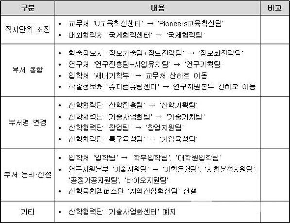 △교무처 Pioneers교육혁신팀장 신현배 선임행정원 △교무처 새내기학부 팀장 조아라 선임행정원 △입학처 학부입학팀장 백승민 선임행정원 △입학처 대학원입학팀장 김지연 책임행정원 △학술정보처 문헌정보팀장 이영철 선임행정원 △학술정보처 정보화전략팀장 임종희 책임행정원 △학술정보처 정보보안팀장 범수균 책임행정원 △공과대학 교학팀장 최용준 책임행정원 △자연과학대학 교학팀장 김영기 책임행정원 △연구처 연구기획팀장 이광호 선임행정원 △연구처 연구관리팀장 손수연 선임행정원 △산학협력단 산학기획팀장 전정민 선임행정원 △산학협력단 기술가치팀장 차수미 선임행정원 △산학협력단 창업지원팀장 강민욱 선임행정원 △산학협력단 기업육성팀장 장준용 선임행정원 △대외협력처 국제협력팀장 최영일 선임행정원 △연구지원본부 기획운영팀장 김철수 선임행정원 △연구지원본부 시험분석지원팀장 박지혜 선임행정원 △연구지원본부 공정가공지원팀장 이경선 선임행정원 △연구지원본부 슈퍼컴퓨팅센터 팀장 김선미 책임행정원 △산학융합캠퍼스단 통합행정지원팀장 조현래 책임행정원