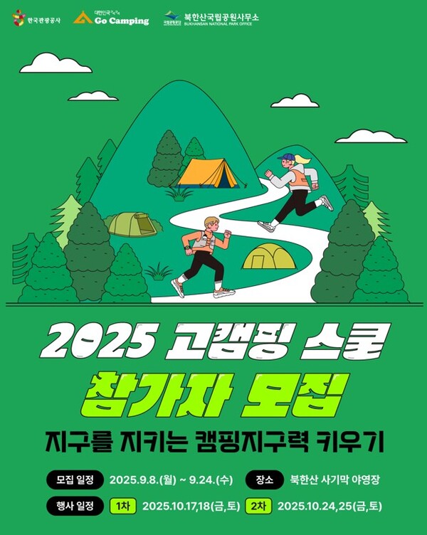 한국관광공사(사장직무대행 서영충)는 9월 8일부터 24일까지 북한산 사기막야영장에서 열리는 친환경 캠핑 이벤트 '2025 고캠핑 스쿨' 참가자를 모집한다고 8일 밝혔다.올해로 4년 차를 맞은 고캠