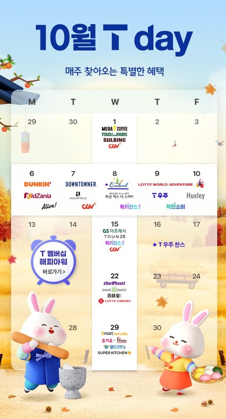 SK텔레콤이 추석 연휴를 맞아 테마파크, 건강검진, 구독 서비스 등 10월 T멤버십 혜택을 강화한다.