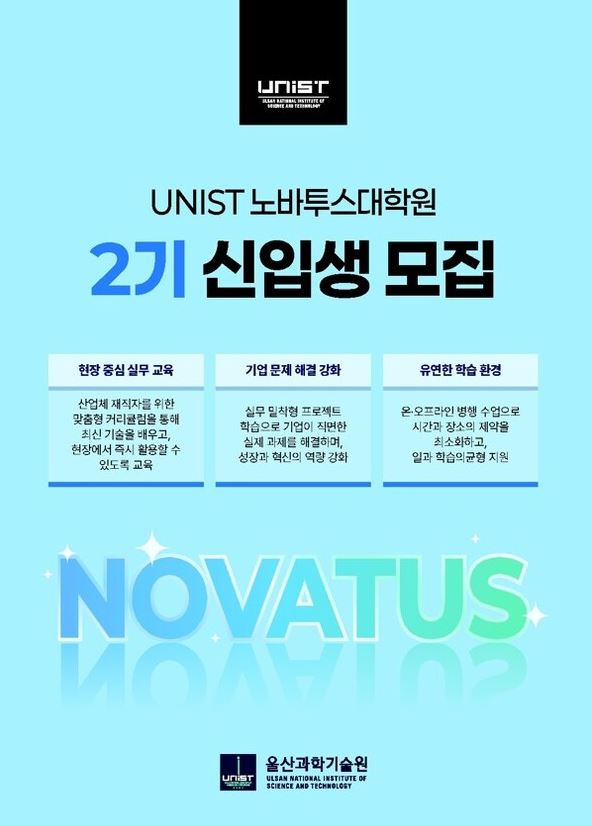 UNIST 노바투스대학원이 내달 5일까지 2026학년도 전기 석사과정 신입생을 모집한다.
