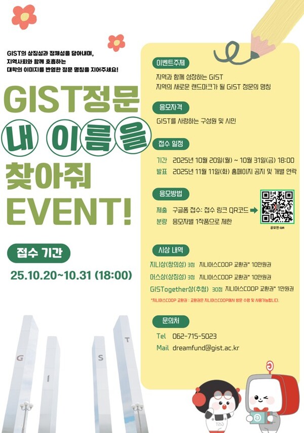 광주과학기술원(GIST)이 오는 31일까지 새롭게 조성된 정문의 이름을 선정하기 위한 네이밍 이벤트 'GIST 정문, 내 이름을 찾아줘'를 진행한다.