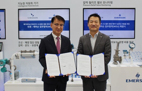 한국에머슨이 21일부터 24일까지 부산 벡스코에서 열리는 '코마린(KORMARINE) 2025'에서 빈센(VINSSEN)과 메가와트(MW)급 연료전지 시스템 통합 제어 솔루션 개발을 위한 전략적 업무협약(MOU)을 체결했다