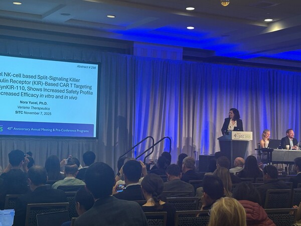 HLB이노베이션 미국 자회사 베리스모 테라퓨틱스가 지난 7~9일(현지시간) 미국 메릴랜드에서 개최된 '미국면역항암학회(SITC 2025)'에서 고형암 CAR-T 치료제 'SynKIR-110'의 전임상 결과를 구두 발표했다.