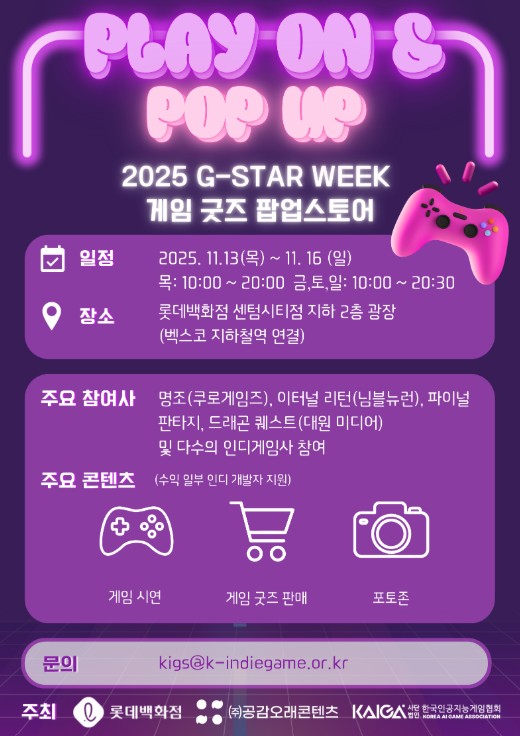 사단법인 한국인공지능게임협회는 공감오래콘텐츠, 롯데백화점과 오는 13일부터 16일까지 부산 롯데백화점 센텀시티점 지하 2층 광장에서 게임 IP 기반 팝업스토어 'PLAY ON & POP UP'을 개최한다고 1