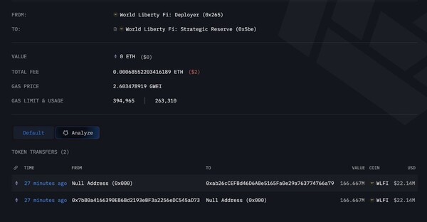 에밋 갤릭(Emmett Gallic) 온체인 애널리스트는 월드리버티파이낸셜(WLFI)이 '피싱 피해' 지갑이 보유한 1억6,666만7,000 WLFI(약 2,214만달러)를 긴급 소각하고 '복구 지갑'으로 재배분했다고 19일(현지시간