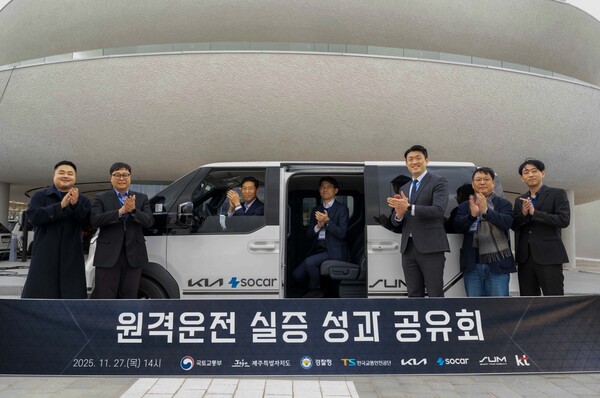 기아가 지난 27일 제주도에서 국토교통부, 제주특별자치도, 경찰청, 한국교통안전공단과 쏘카, 자율주행 스타트업 에스유엠(SUM), KT 등 관계자들이 참석한 가운데 '원격 운전 실증 성과 공유회'를 열고 기술 개발 현황을 공개했다.
