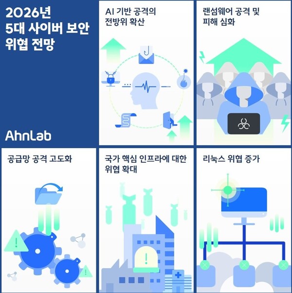 안랩(대표 강석균)은 2026년에 예상되는 주요 사이버 보안 리스크를 분석한 '2026년 5대 사이버 보안 위협 전망'을 발표했다.안랩은 내년 주목해야 할 핵심 위협으로 △인공지능(AI) 기반 공격의 전