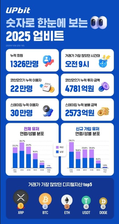 디지털자산 거래소 업비트를 운영하는 두나무(대표 오경석)가 2025년 한해 동안의 주요 이용 현황을 담은 인포그래픽을 2일 발표했다.두나무에 따르면 2025년 12월 22일 기준 업비트 누적 회원 수는