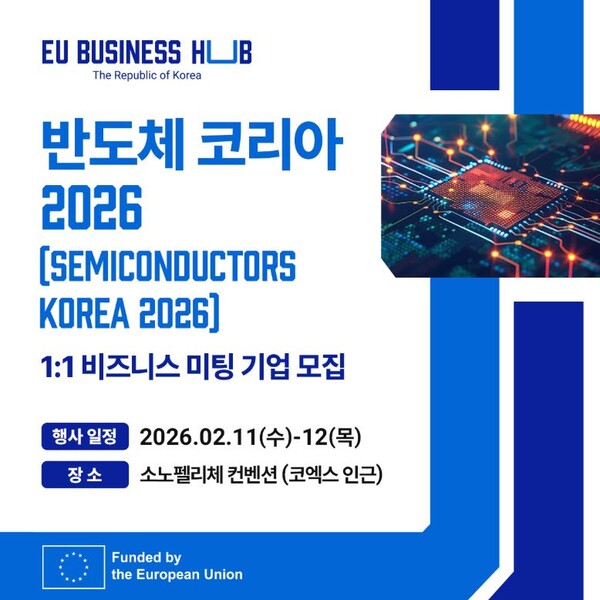 EU 비즈니스 허브(EU Business Hub)가 2월 11~12일 양일간 코엑스 인근 소노펠리체 컨벤션에서 '반도체 코리아 2026(Semiconductors Korea 2026)' 전시상담회를 개최한다.