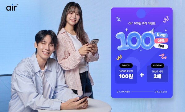 SKT가 자급제 서비스 '에어(air)'의 출시 100일을 맞아 오는 24일까지 에어 신규 가입자를 대상으로 '100일 100GB를 100원에' 이벤트를 실시한다.